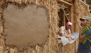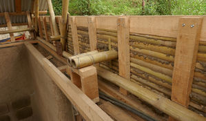 The design of this structure incorporates locally available materials of stone, bamboo, straw, wood, sand and clay rich soil. The straw bale walls are highly insulating and together with the staw/clay ceiling insulation help keep the interior space warm in the winter and cool during summer.